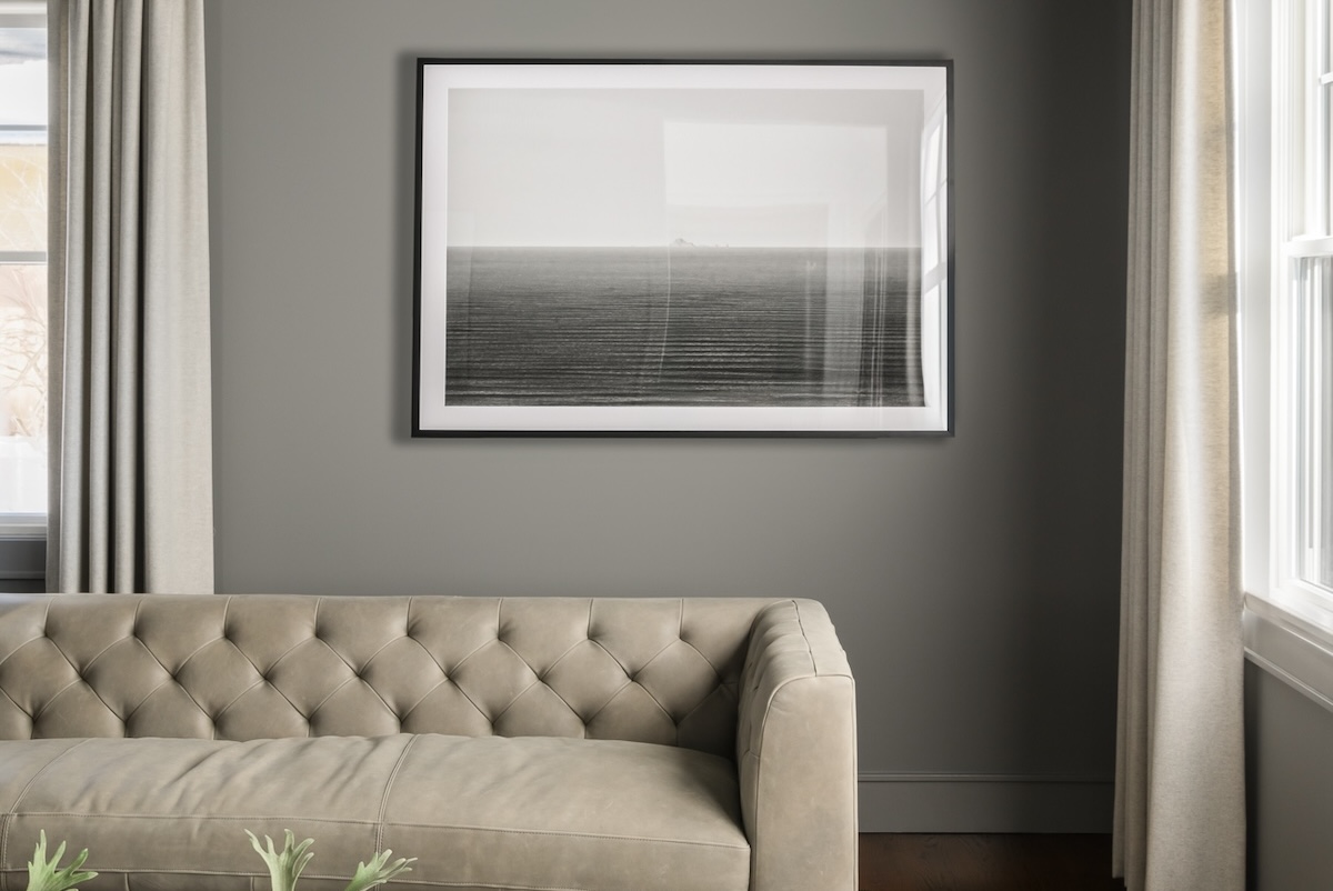 A monochromatic seascape from La Mar Collective reflects the room’s minimalist tonal palette; its large scale adds drama without disrupting the room’s relaxed vibe.