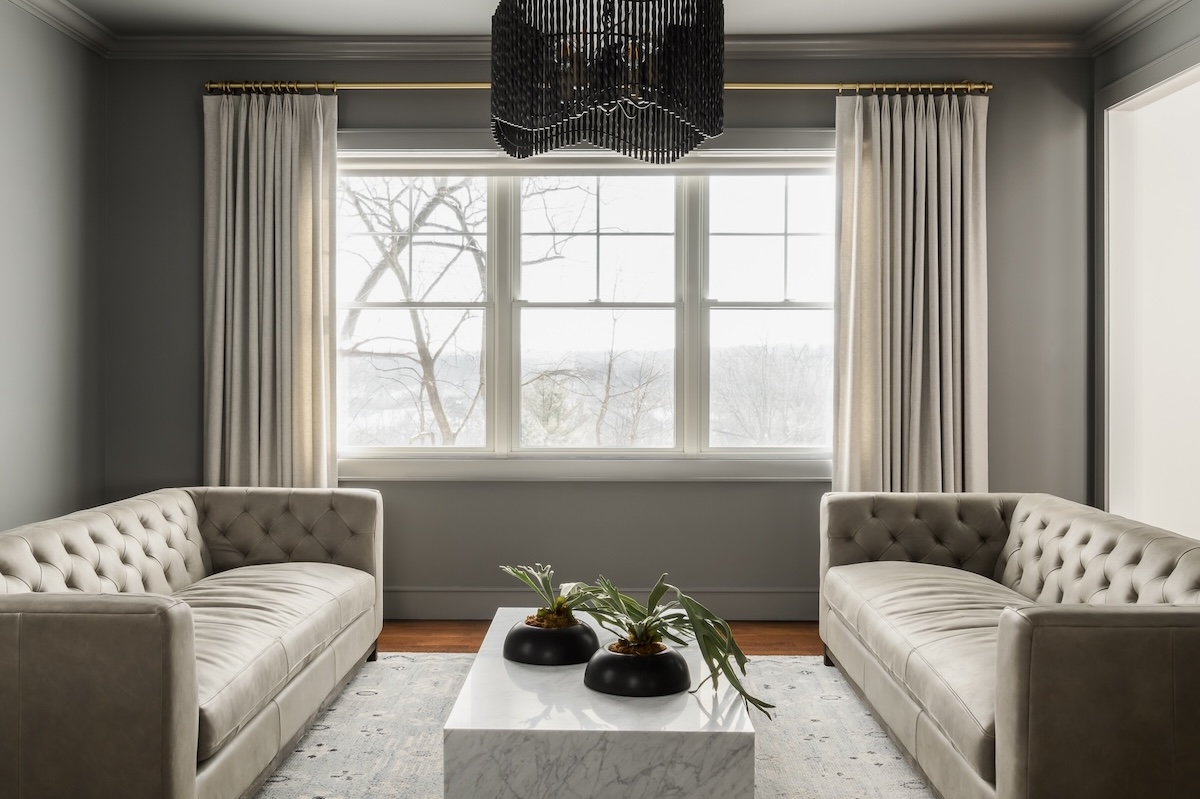 A plush, neutral Surya rug adds depth and warmth underfoot, while a Made Goods chandelier above brings subtle drama. Sherwin-Williams’s Classic French Gray coats the walls, contrasted by crisp white trim that frames the architecture and enhances the airy feel.