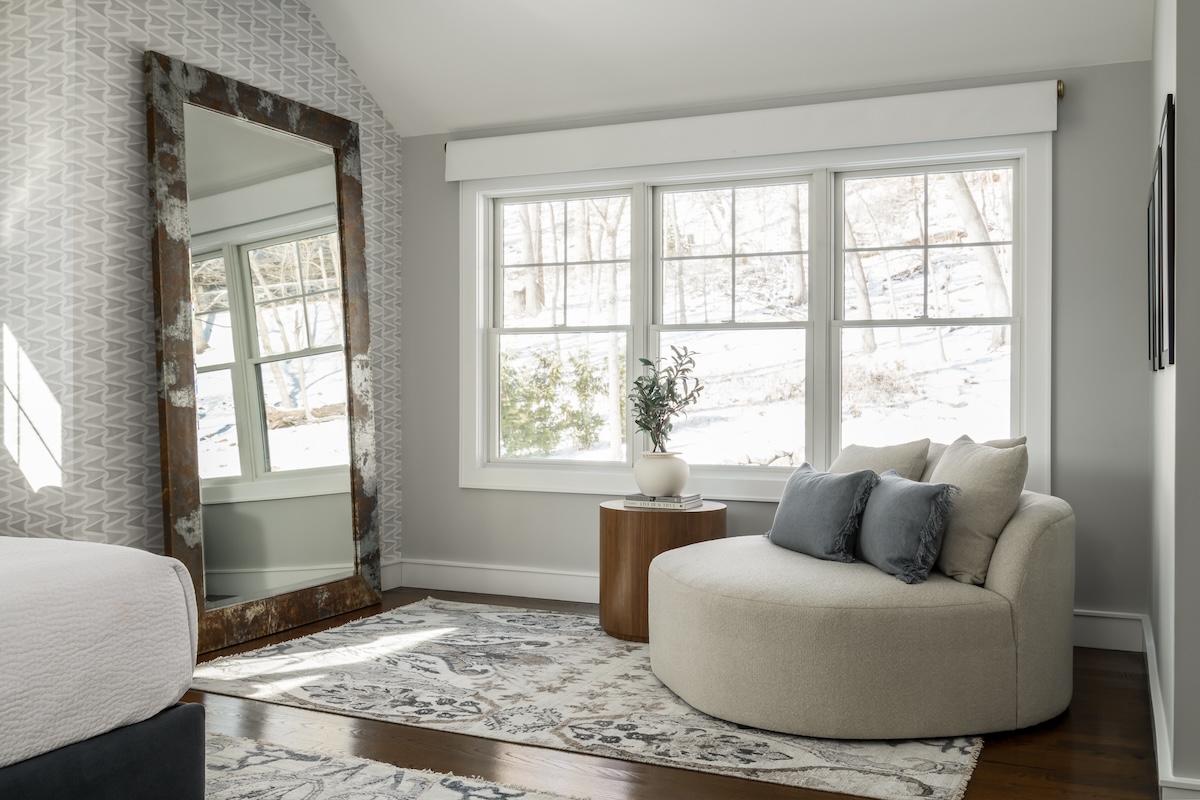Complementary area rugs unite the sleeping and seating areas. The cozy reading nook features a floor-to-ceiling mirror from Arhaus and a cushioned chaise accented with comfy pillows. A wooden side table introduces an earthy, grounded element.