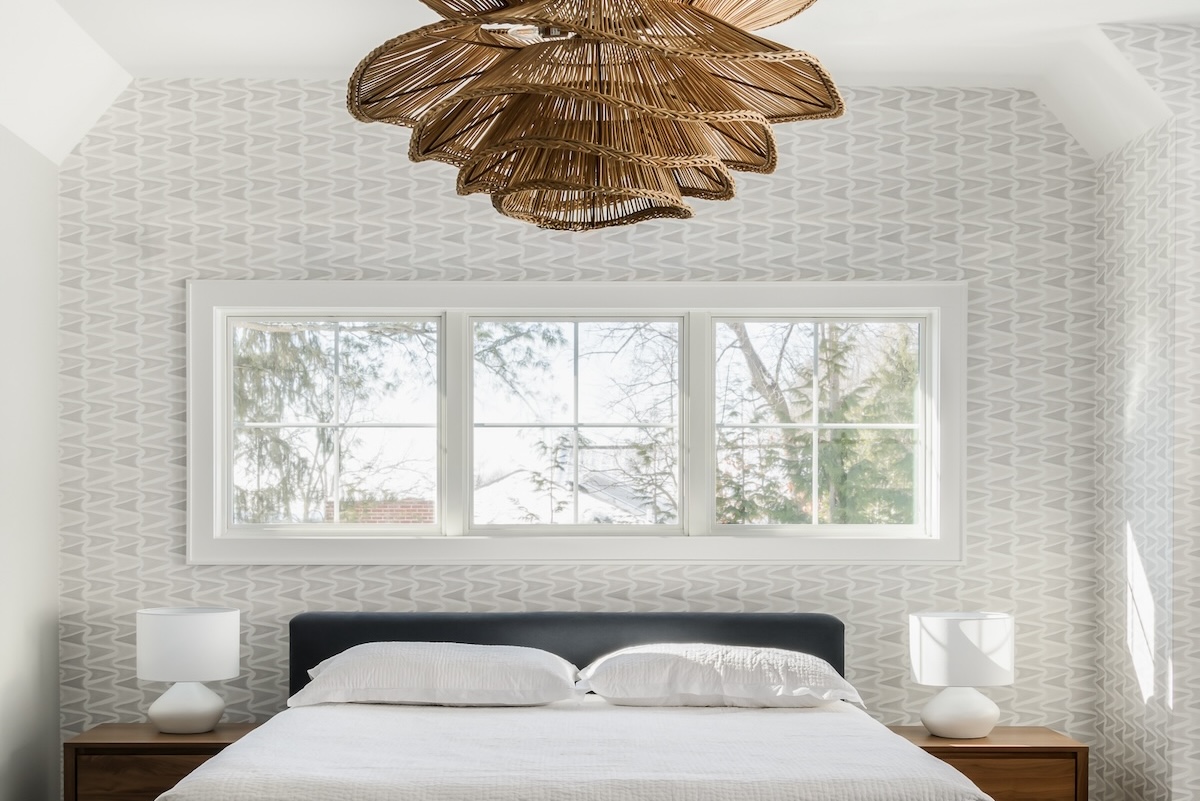 In the primary bedroom, geometric Victoria Larson wallpaper and Room & Board nightstands frame the upholstered bed while the Made Goods chandelier adds an eye-catching sculptural element.